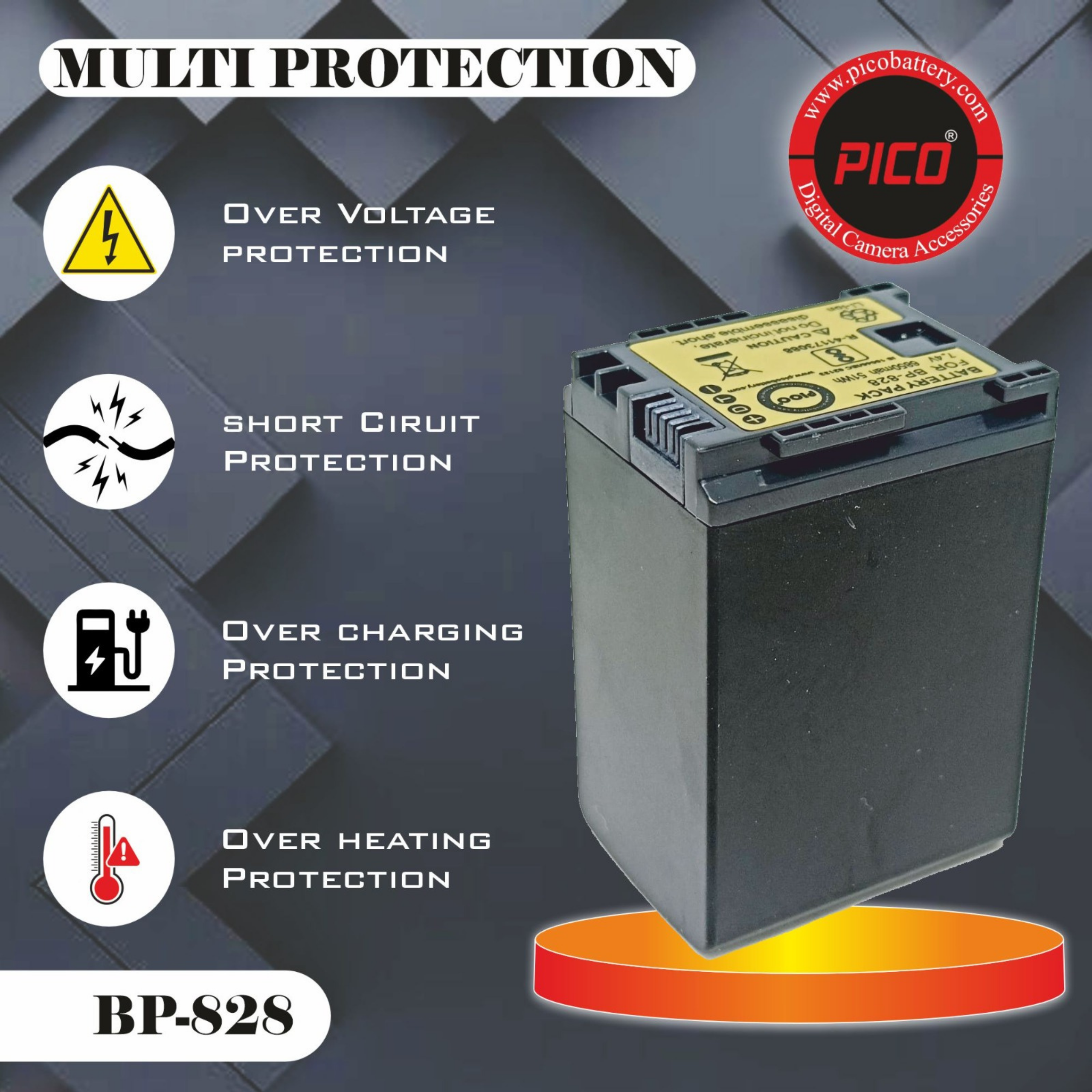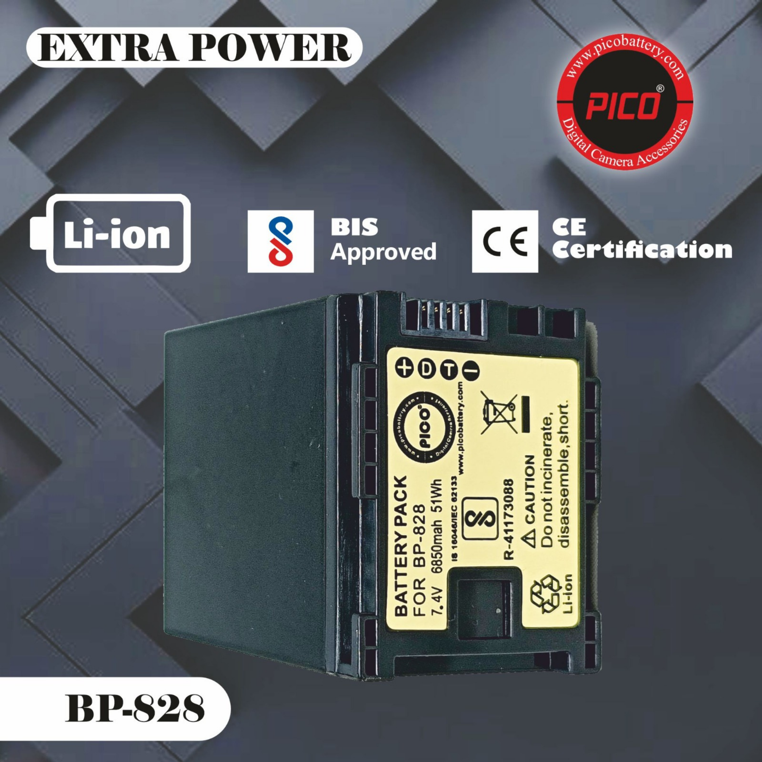 Designed to meet or exceed original manufacturer specifications, the Pico BP-828 features intelligent circuitry that communicates with your Canon camcorder to provide an accurate remaining-time display (down to the minute). With no “memory effect,” you can top off your charge at any time without degrading the battery’s long-term health.