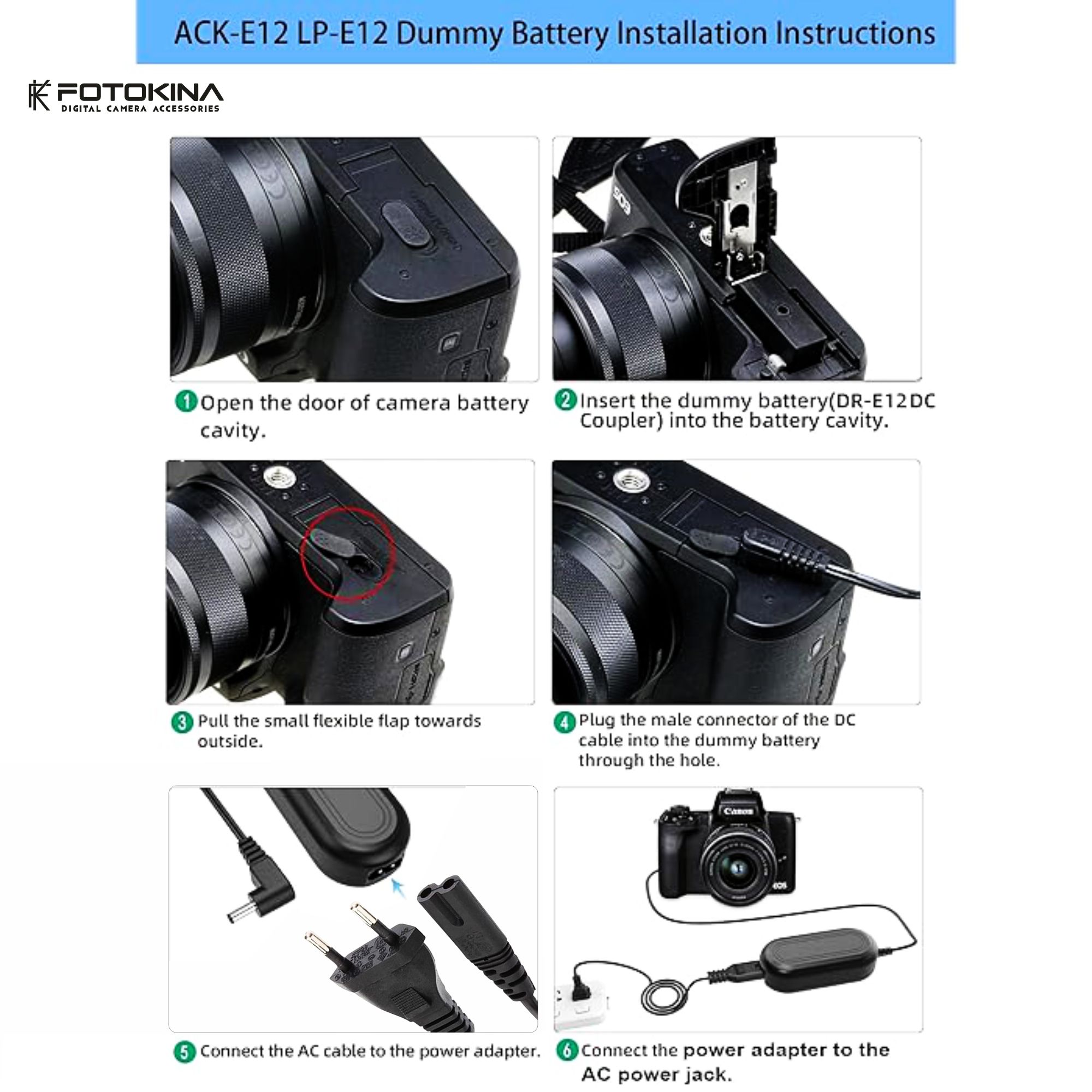 Continuous Power Supply: Replace your standard Canon LP-E12 battery with the included DR-E12 DC Coupler (Dummy Battery) and connect it directly to an AC wall outlet via the power adapter. This provides a constant, stable power source, eliminating the need to constantly monitor and swap batteries.