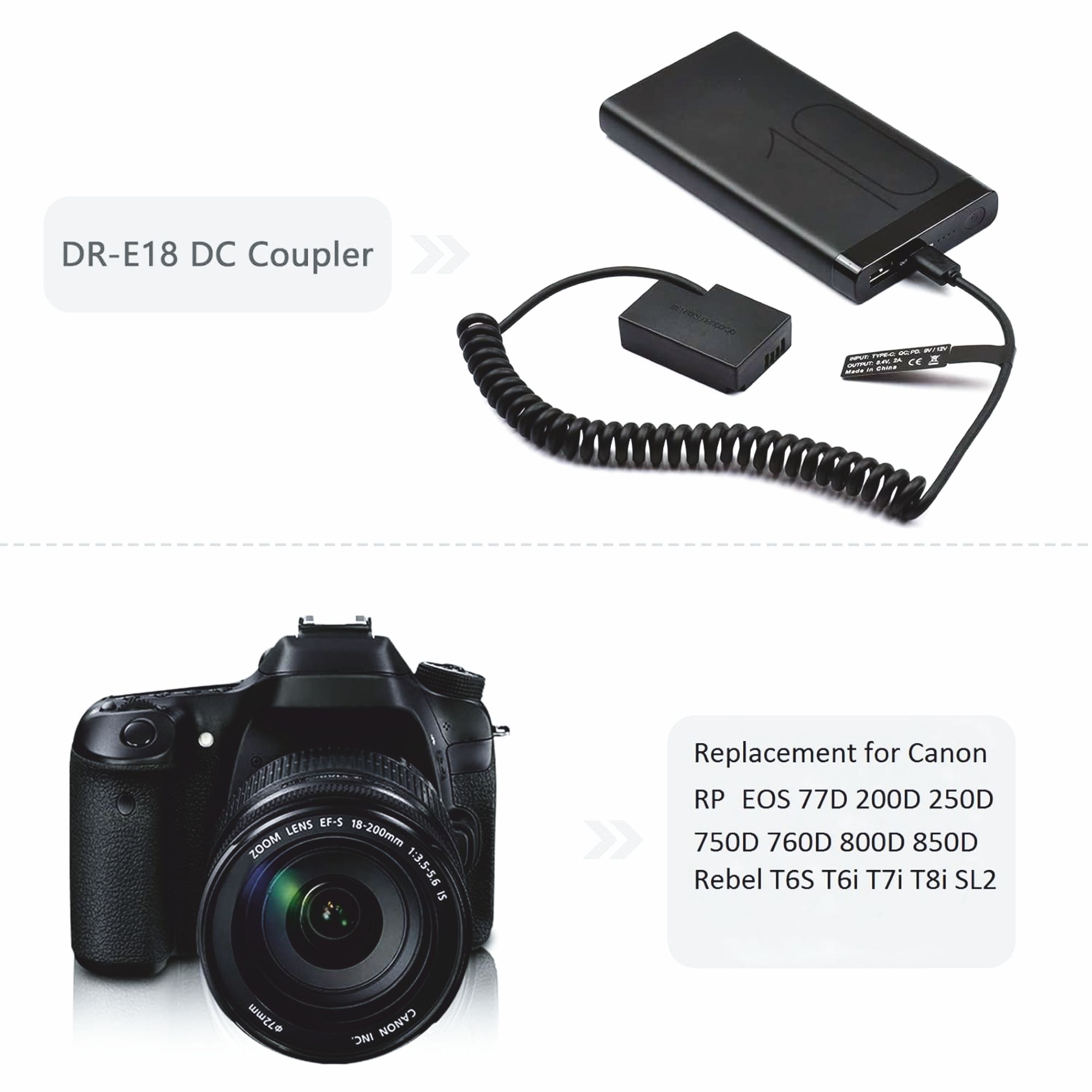 Continuous Power Supply: Replace your standard Canon LP-E17 battery with the DR-E18 DC Coupler and connect it to any compatible USB-C power source (power bank, wall charger, etc.) for continuous, reliable power. Ideal for studio work, time-lapses, vlogging, and long video takes.