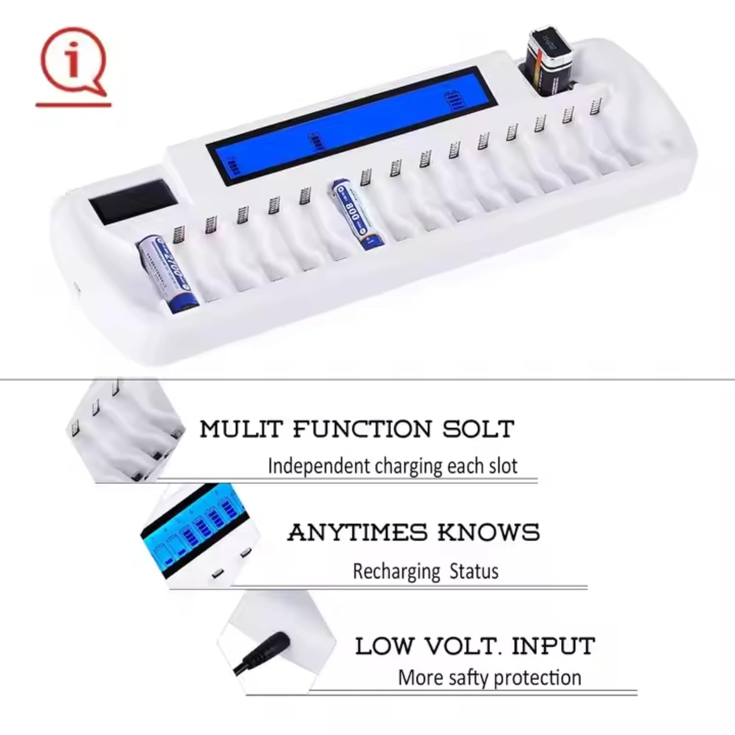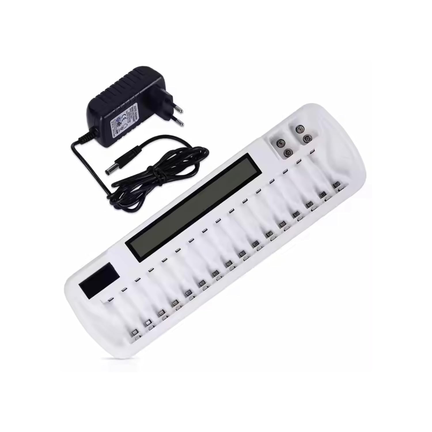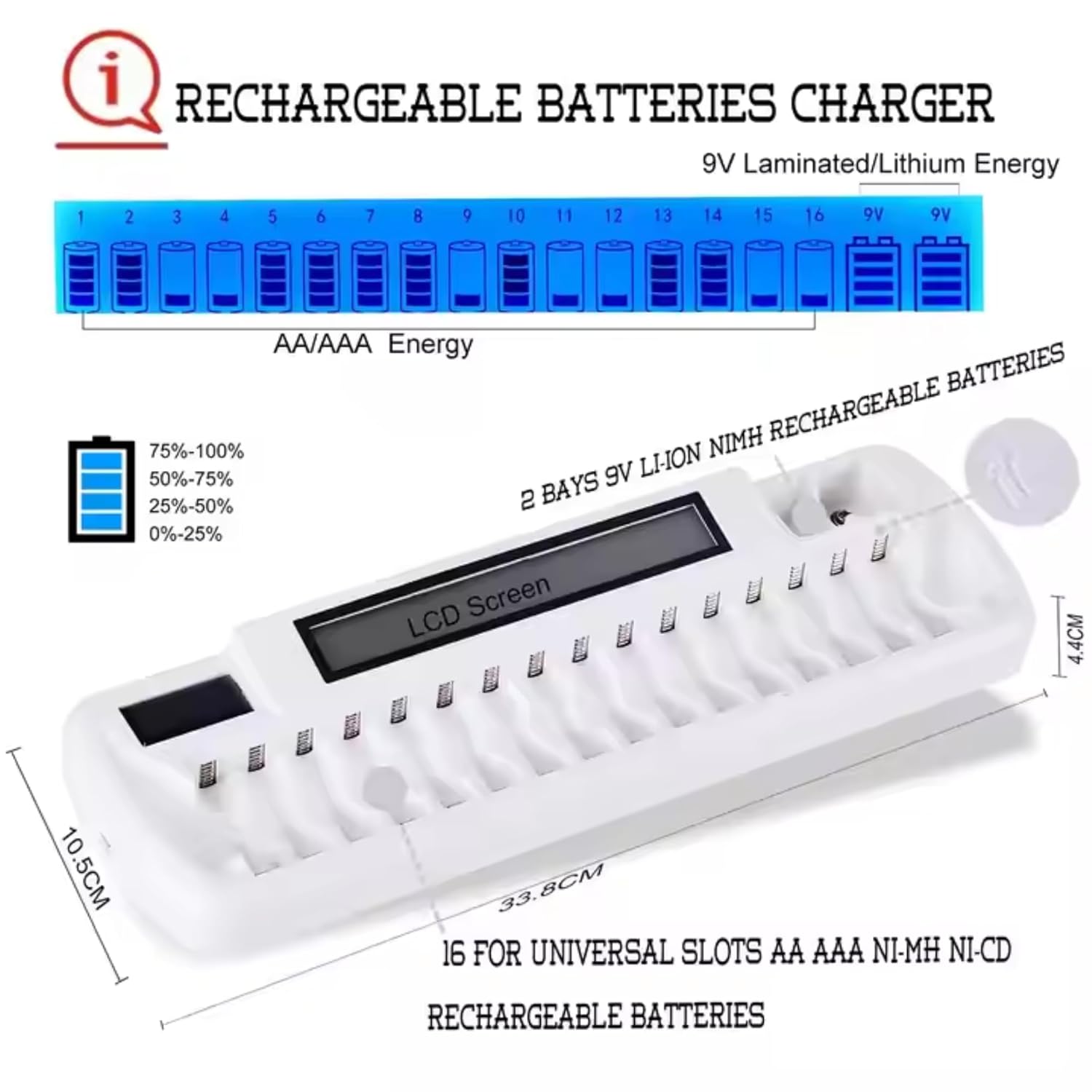 Multi-Function Slots: Charge up to 16 batteries simultaneously! Accommodates AA, AAA, Ni-MH, and Ni-CD batteries. Plus, it includes two dedicated bays for 9V laminated/lithium rechargeable batteries.