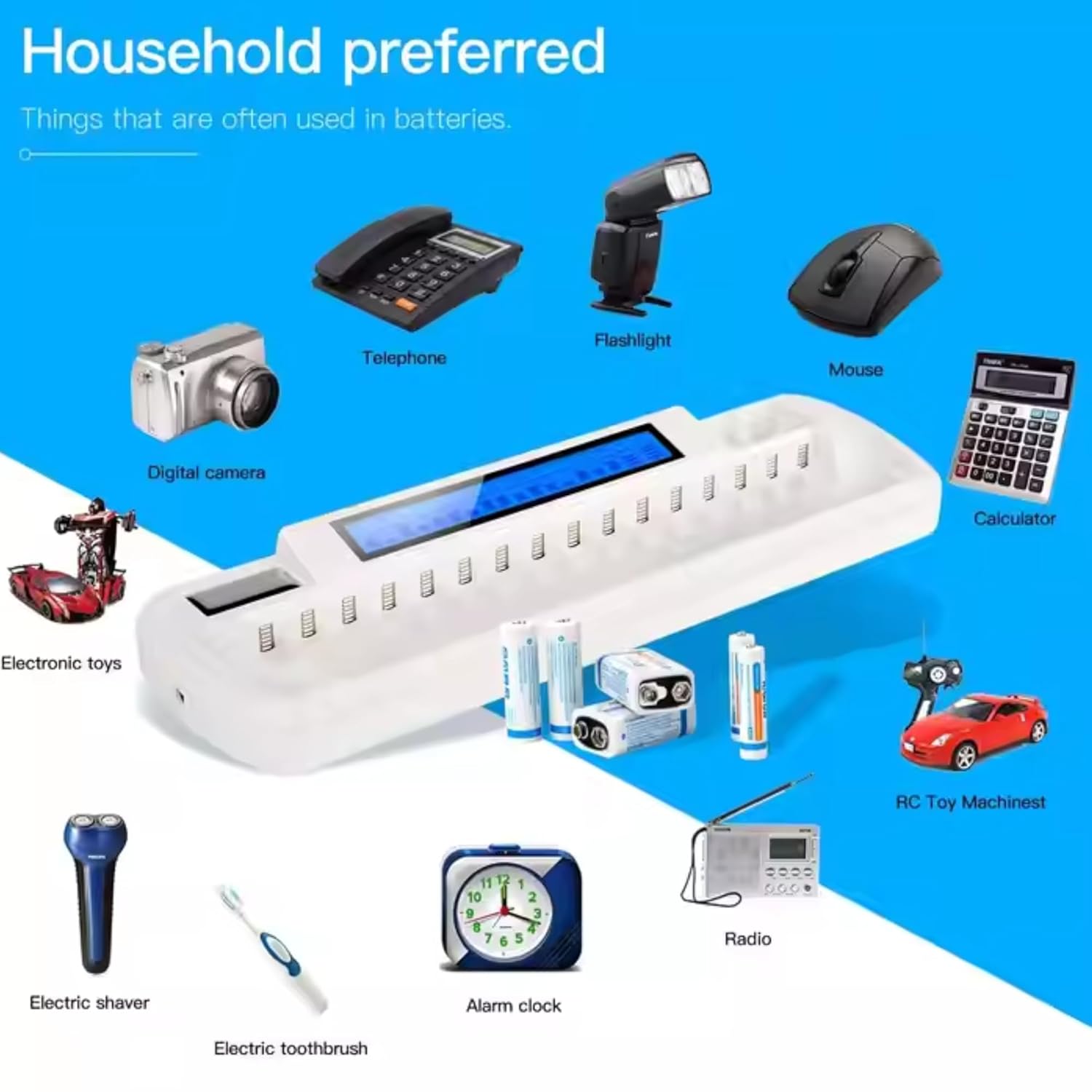 Designed for convenience and safety, this charger features an impressive 16 universal slots, making it the perfect central charging station for all your battery-powered devices—from digital cameras and electronic toys to flashlights, RC gear, and everyday appliances like electric shavers and toothbrushes.